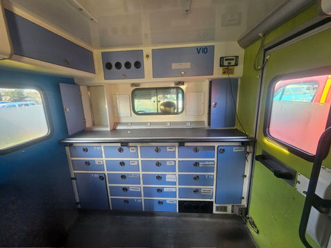 Aménagement : Véhicule bureau mobile ancienne ambulance aménagée, intérieur isolé, isolation thermique et phonique de l'ensemble recouverte d'un revêtement polyester armé, plancher isolé et renforcé en polyester armée antidérapant, fenêtres latérales, double porte arrière vitrée, ventilation électrique de toit mode aspiration ou soufflerie, circuit 12v auxiliaire avec prises + circuit 220v avec prises disjoncteurs borne bleue externe, borne bleue externe pour alimentation en 220v, tableau de commande présent, marche pied arrière ,éclairage, toutes les fenêtres sont en verre haut de gamme SECURIT.